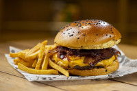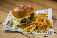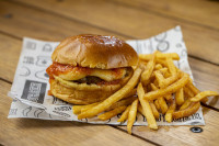 Feito com pão brioche, 2 hambúrguers bovino caseiro de 100g, bacon, creme de cheddar, picles de cebola reduzido com vinho tinto e molho especial do chef. Para quem tem fome.
